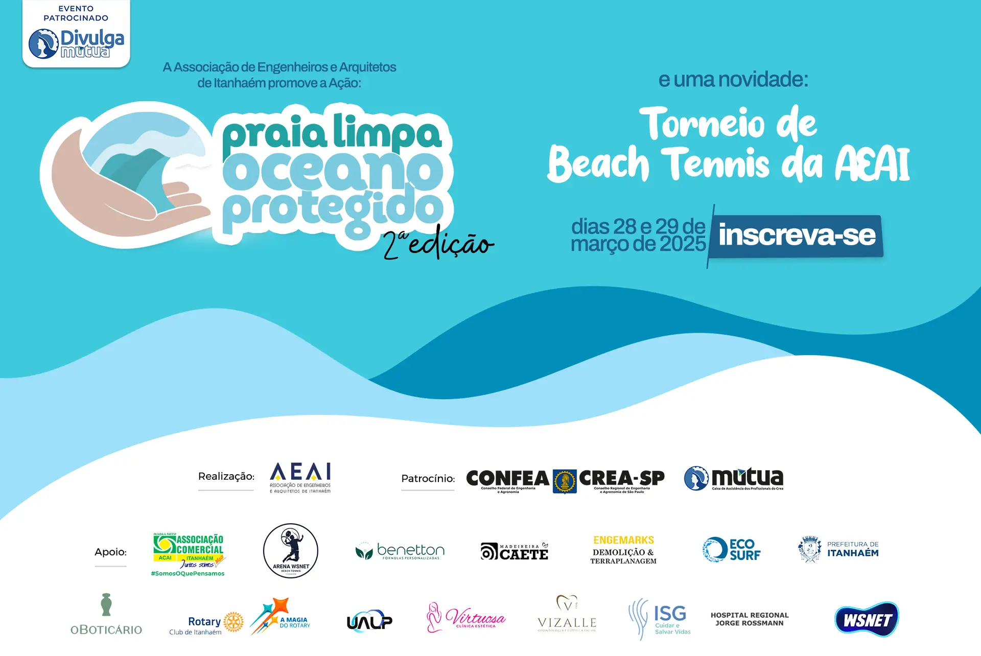 Nos dias 28 e 29 de março, Itanhaém será palco da Ação Praia Limpa, Oceano Protegido, iniciativa da Associação dos Engenheiros e Arquitetos de Itanhaém (AEAI) que visa conscientizar a população sobre a importância da preservação ambiental. O evento contará com palestras educativas, uma mobilização de limpeza na orla da praia e, pela primeira vez, um Torneio de Beach Tennis.